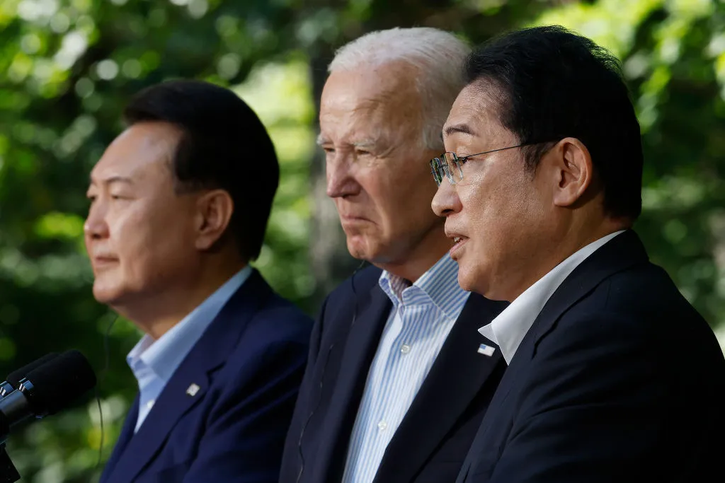 韩国总统尹锡悦、美国总统乔·拜登和时任日本首相岸田文雄(从左到右)在2023年于戴维营。