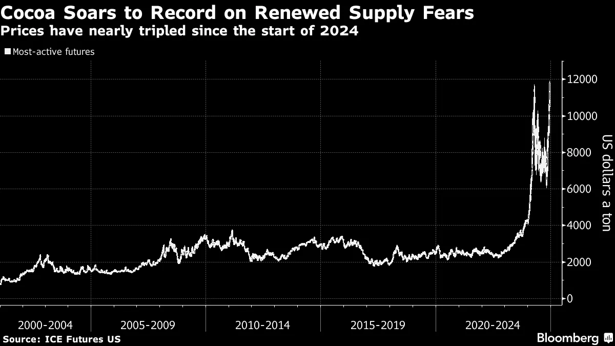西非的可可丰收不佳——全球最大的可可中心——使世界陷入了有史以来最大的供应赤字,而科特迪瓦前景的减弱将使重建这些库存变得更加艰难。这可能会抑制交易员之前对小幅盈余的期望,并延续价格的惊人上涨,这对巧克力制造商和消费者都造成了影响。可可期货本周飙升至每吨11,925美元的历史新高。
