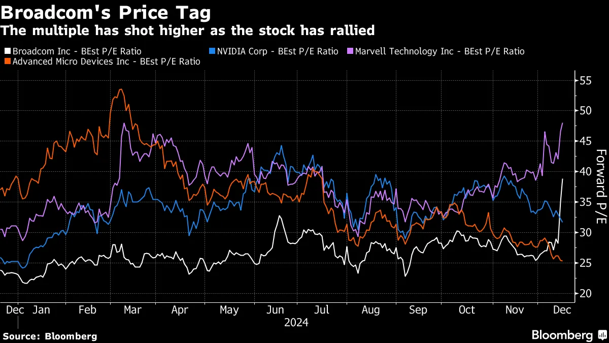 这个倍数——投资者为股票支付的价格与未来12个月预计利润的比率——正在达到创纪录的水平。这可能表明博通几乎没有犯错的空间,尽管英伟达为希望抓住下一个人工智能赢家的投资者创造了乐观的先例。英伟达去年的利润增长如此迅速,以至于随着股价上涨,估值实际上变得更便宜,因为预期的增长速度更快。博通2025财年的每股收益预期在上周上涨了12%。
