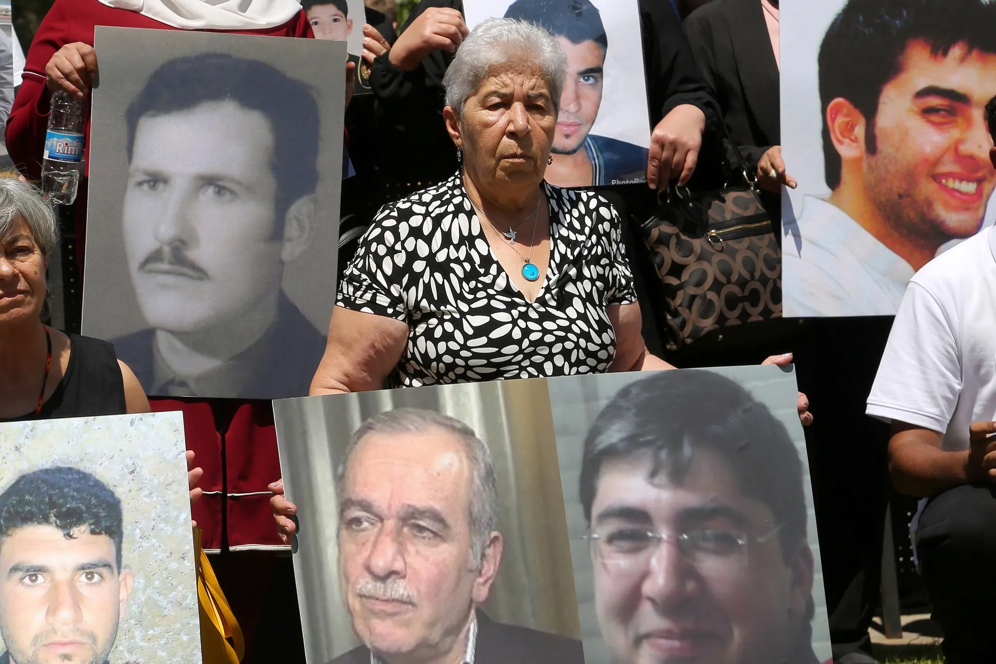 法德瓦·马哈茂德,中心,在2023年8月贝鲁特举行的国际失踪受害者日纪念仪式上。摄影师:马尔万·纳阿曼尼/图片联盟/盖蒂图片社“这个问题关乎每一个叙利亚人,”马哈茂德说。“这正是我们都渴望的真相与正义的核心。”