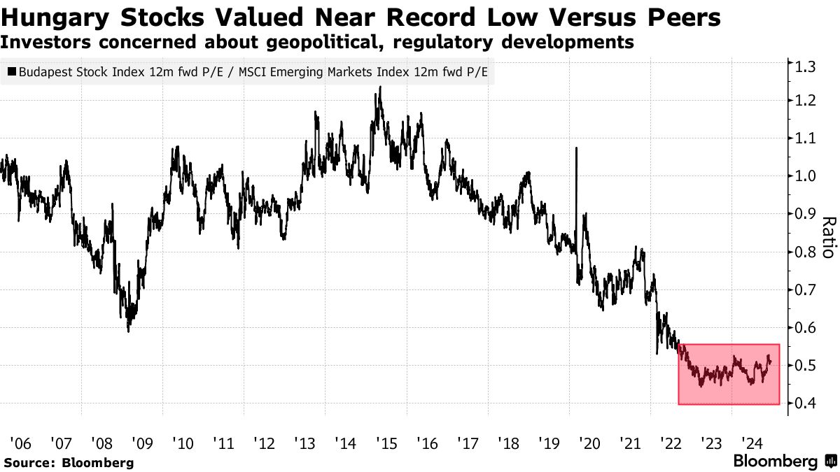 这样的条件可能会延续布达佩斯的BUX股票指数的上涨,该指数在今年击败了超过85%的全球同行,因当地利率下降而出现了国内储蓄的转移。然而,即使在2024年上涨30%之后,与同行相比,估值仍然具有吸引力。该指数的交易价格是其成分股预期收益的六倍,仅为MSCI新兴市场基准的一半。