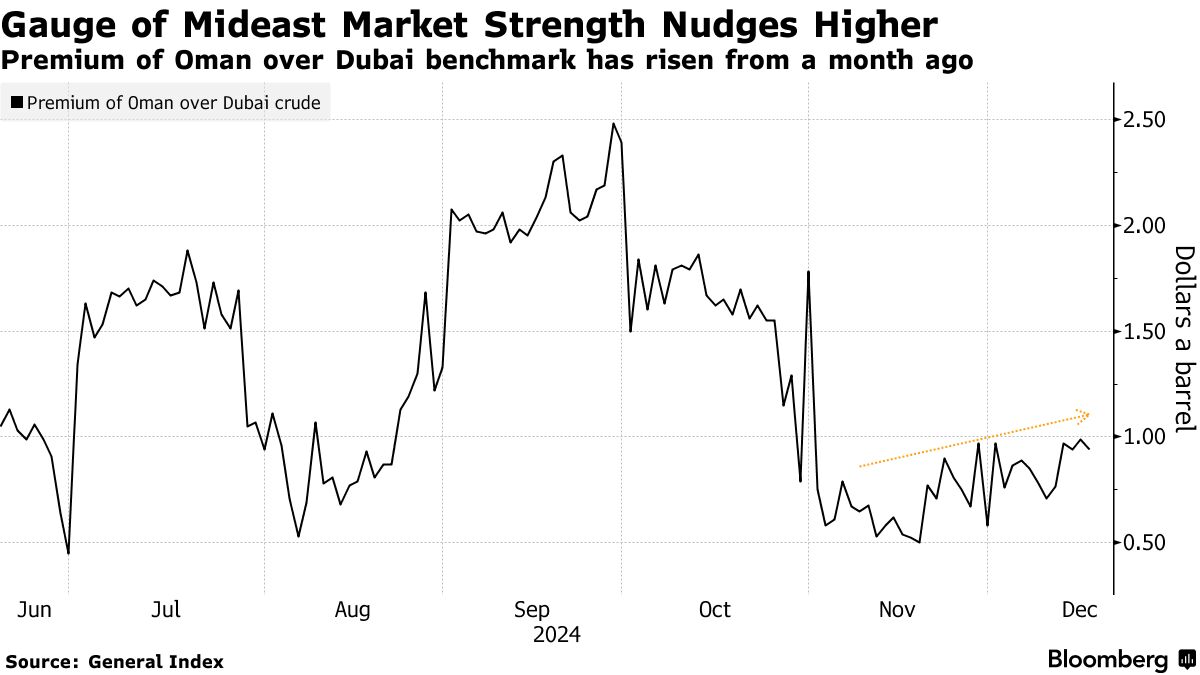 根据General Index的数据,阿曼原油——在中国炼油商中颇受欢迎的一个品种——以及阿联酋的穆尔班原油的价格在过去一个月相对于迪拜基准也有所上涨。