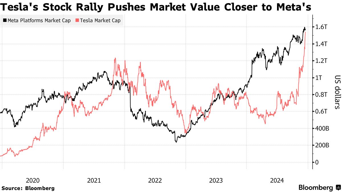 Meta Platforms Inc.的股票今年上涨了75%,将其市场价值推升至创纪录的1.6万亿美元,因为马克·扎克伯格将这家社交媒体公司重新定位为人工智能创新者。然而,埃隆·马斯克的Tesla Inc.正在迎头赶上,年初至今上涨了93%,将其市值推高至1.5万亿美元。这家电动车制造商受益于马斯克与当选总统唐纳德·特朗普的密切关系,以及好于预期的业绩。
