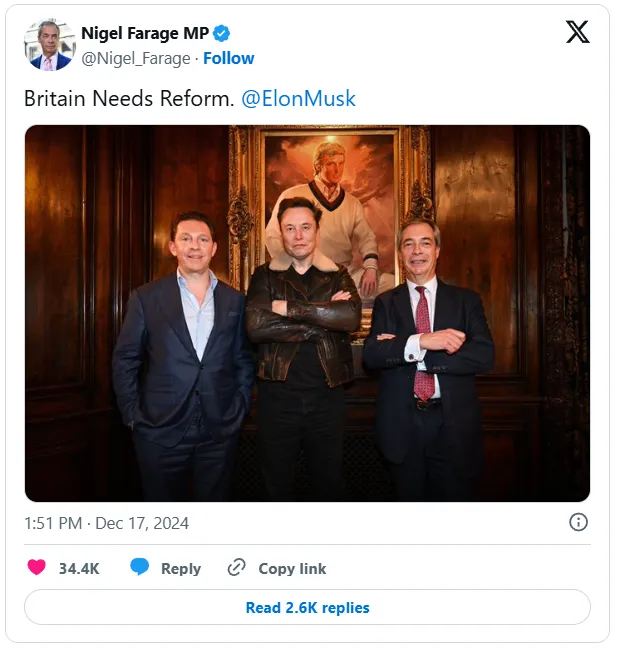 来源:推特来源:推特埃隆·马斯克正在交朋友 跨越海洋。英国民粹主义改革党领袖奈杰尔·法拉奇在当地报纸上写道,他正在与马斯克进行“持续谈判”,关于 一笔政治捐款。马斯克据说正在考虑捐赠高达1亿美元。较不友好的是:参议员伊丽莎白·沃伦挑战特朗普设定伦理防护措施,以控制 “巨大的利益冲突” 由马斯克在其过渡和即将到来的政府中的非正式角色所带来的。