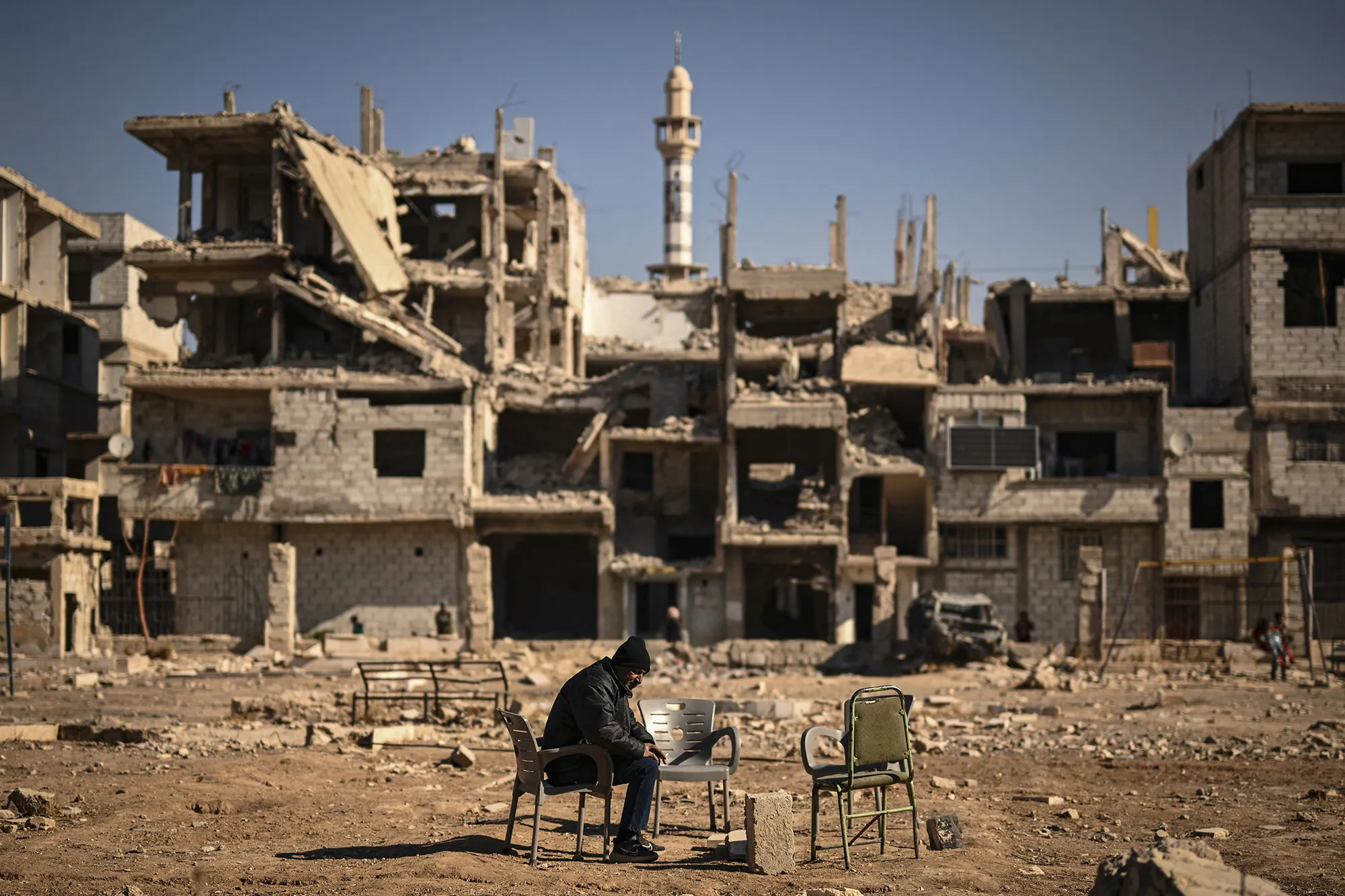 一名男子坐在叙利亚大马士革南部雅尔穆克难民营被毁建筑前,时间是12月14日。摄影师:阿里斯·梅西尼斯/法新社/盖蒂图片社