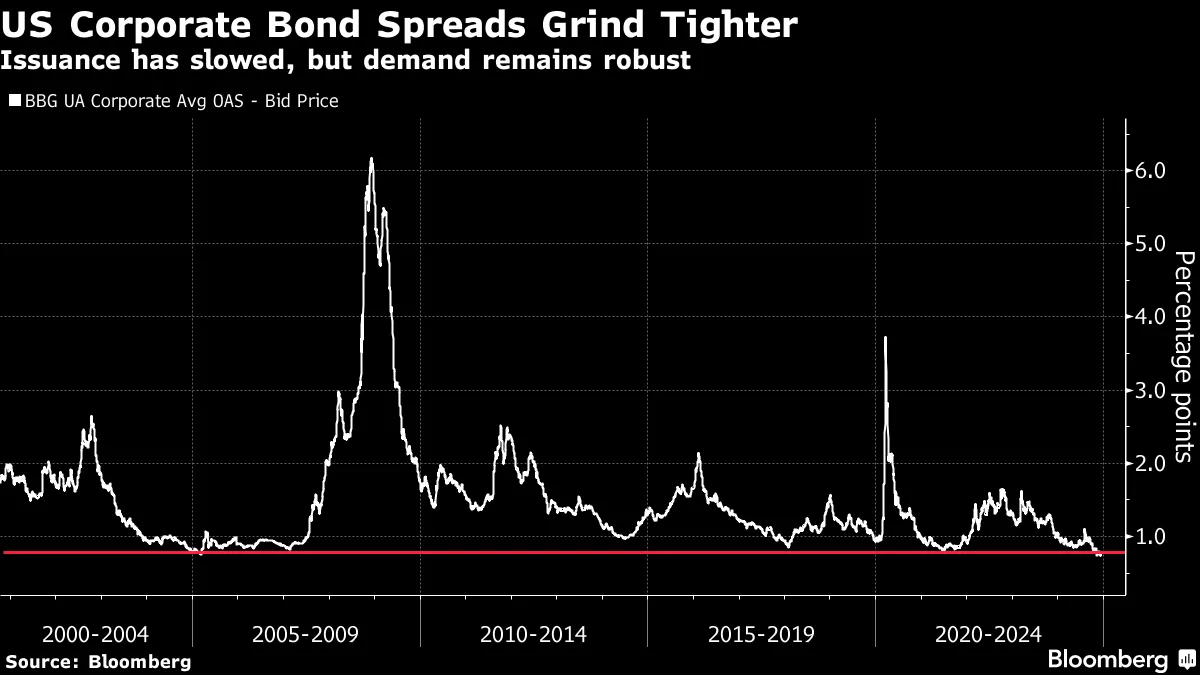 看看现在信用市场的情况,特别是投资级公司债券。正如下面的图表所示,利差(风险溢价)处于多年来的低点,投资者不得不变得更加创造性以产生收益。