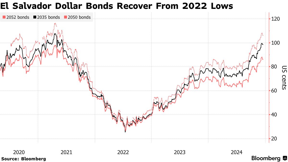 总统纳伊布·布克尔在2021年采用比特币使政府与国际货币基金组织产生了矛盾,导致信用评级下调,吓跑投资者,并使债券价格暴跌。虽然仍需获得基金执行董事会的批准,但该协议将为长期困扰萨尔瓦多债券市场投资者的问题画上句号。
