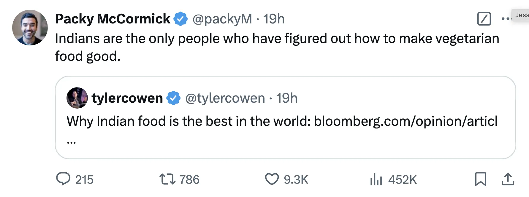 起初,你可能会对 这篇专栏的标题感到惊讶,泰勒·科文 — “为什么印度的食物是世界上最好的” — 并对又一个经济学家突然自认为是美食家而翻白眼。但泰勒带来了一些资历:他在八次访问中去过印度的大部分主要地区和城市。他一生中旅行过100多个国家。而且他承认他的说法是“无疑大胆的”。