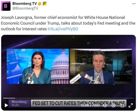今天在彭博电视的 权力平衡 早间版中,主持人凯莉·莱因茨采访了乔·拉沃尔尼亚,前特朗普政府白宫国家经济委员会首席经济学家,讨论美联储及利率和经济的前景。