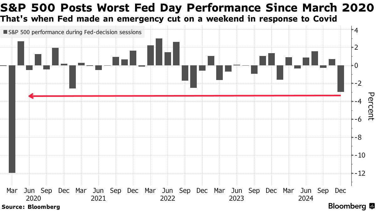 上一次标准普尔500指数在计划的美联储决策日出现如此大幅度的损失,还是在2001年9月17日,当时该指数下跌近5%。在2020年3月16日,即中央银行在疫情期间的紧急周末会议后一天,该指数暴跌12%。