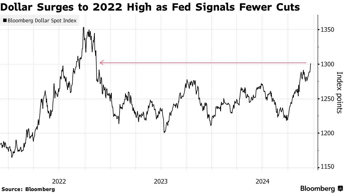 在周三的市场上,彭博美元现货指数飙升至2022年以来的最高点,而欧元、英镑和瑞士法郎均下跌至少1%。离岸人民币也跌至2023年以来的最低水平。