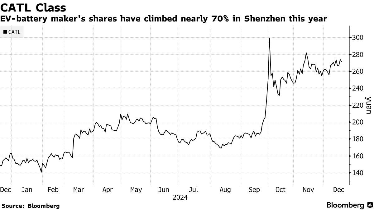 CATL总部位于中国东南部的福建省,在深圳证券交易所上市。今年其股价上涨了65%,得益于9月底中国市场因政府谈论刺激计划而反弹。CATL的市值为1.2万亿元人民币(1640亿美元)。