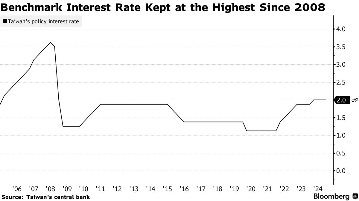 在周四的季度会议上,货币当局将其 基准利率 保持在 2%。彭博社调查的 25 位经济学家均预测中华民国中央银行将维持不变,因为台北的这一机构正式如此称呼。