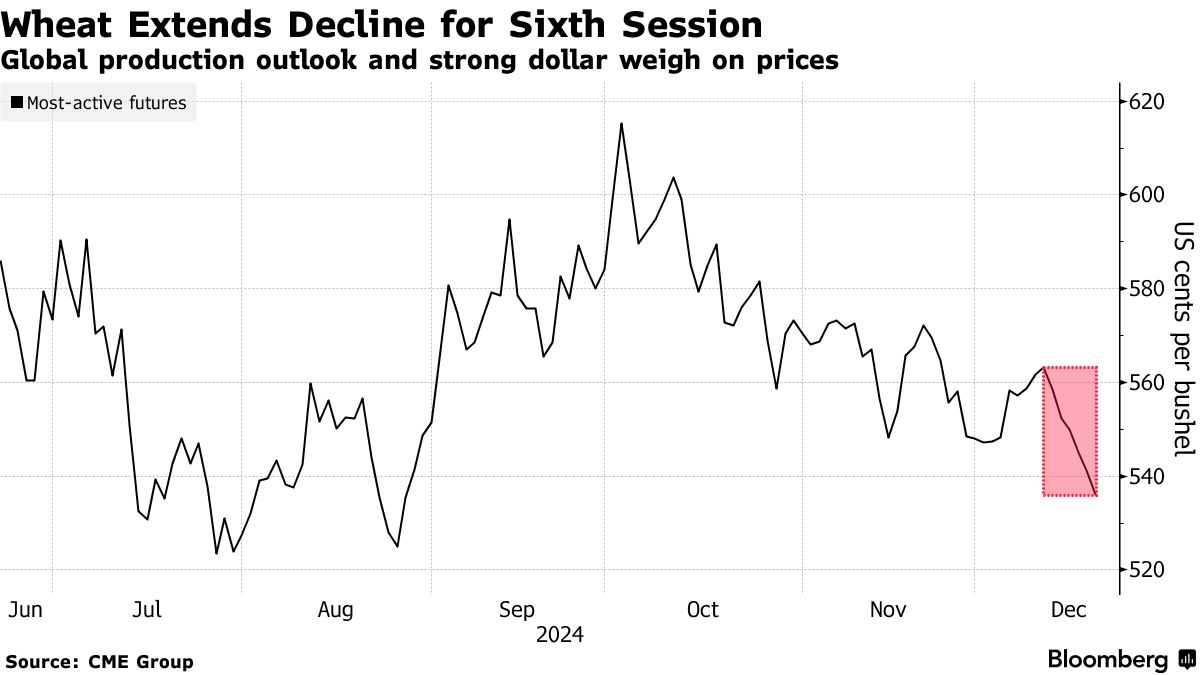 小麦因强劲的供应前景而准备迎来自六月以来最长的亏损周期 - 彭博社