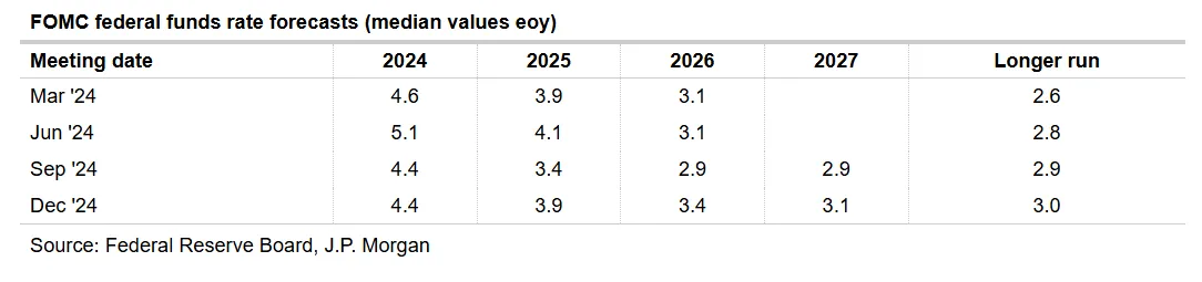 美联储政策制定者更新的政策利率预测也显示出变化。2025年底基准利率的中位数预测从9月份的3.4%上调至3.9%。(当前目标区间的中点为4.4%.)
