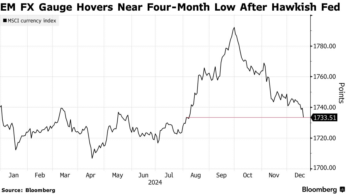 新兴市场货币指数在美联储对明年利率路径的鹰派展望后,因美元普遍走强而延续下跌。