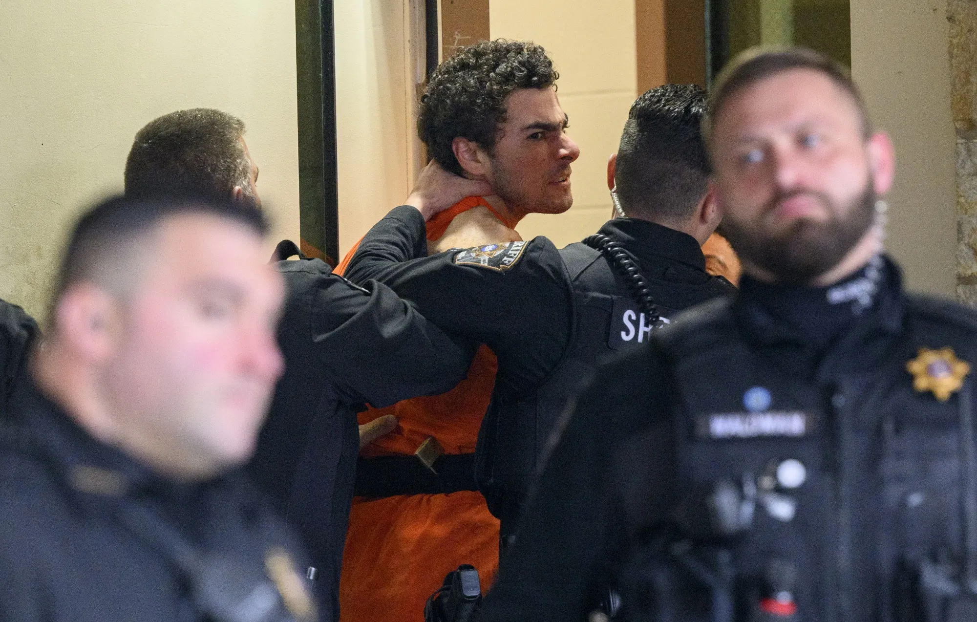 路易吉·曼乔内于12月10日被带入宾夕法尼亚州霍利代斯堡的布莱尔县法院,进行引渡听证。