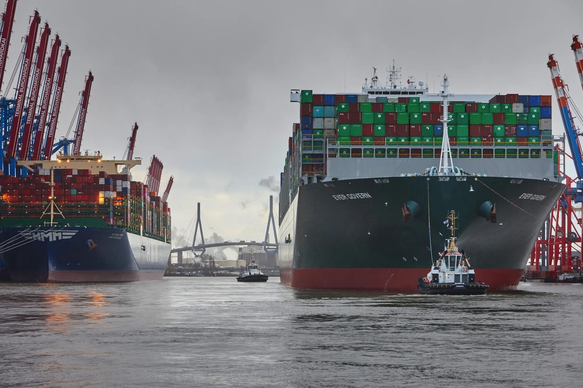一艘集装箱船驶入德国汉堡的汉堡港。