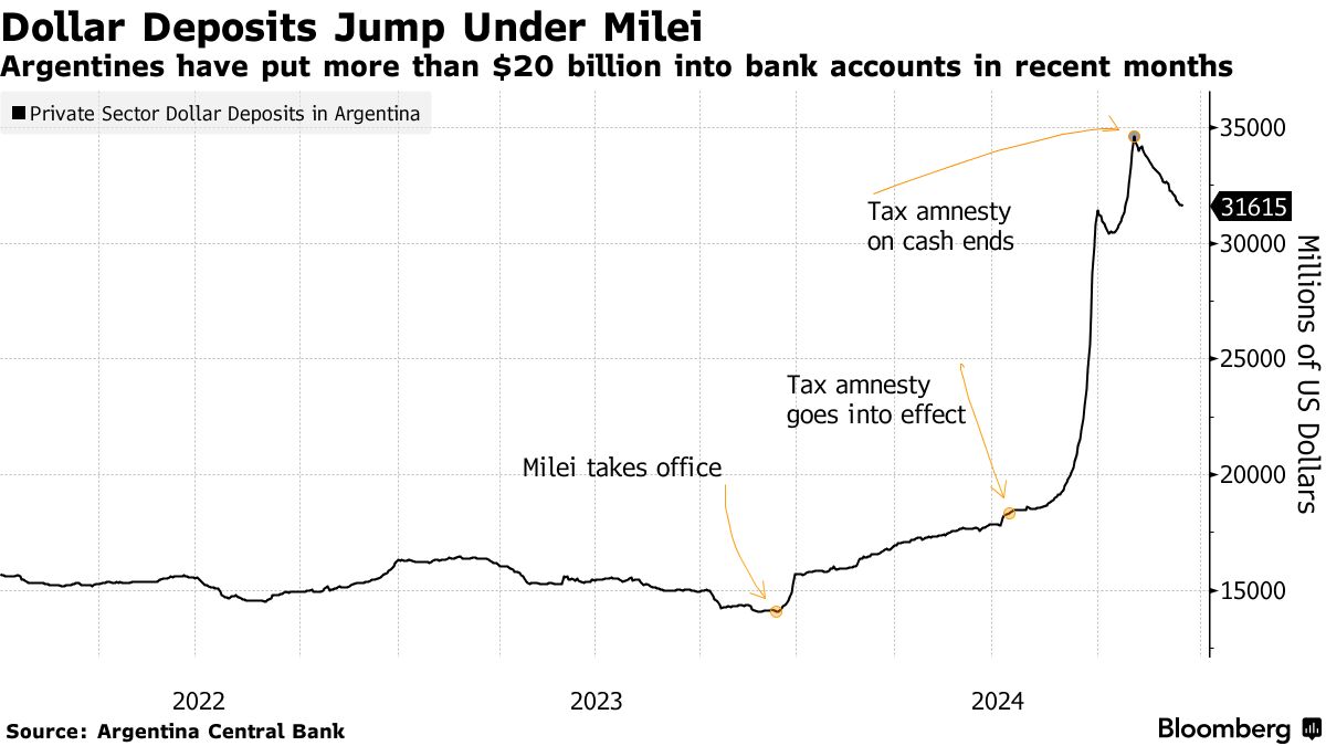 这些举措旨在利用政府税收宽免带来的近期美元流入。在过去五个月中,阿根廷人在当地银行存入了超过200亿美元的资金。这一外币流入,加上政府限制本币供应的措施,帮助比索自7月创下历史最低点以来在黑市上升值超过20%。