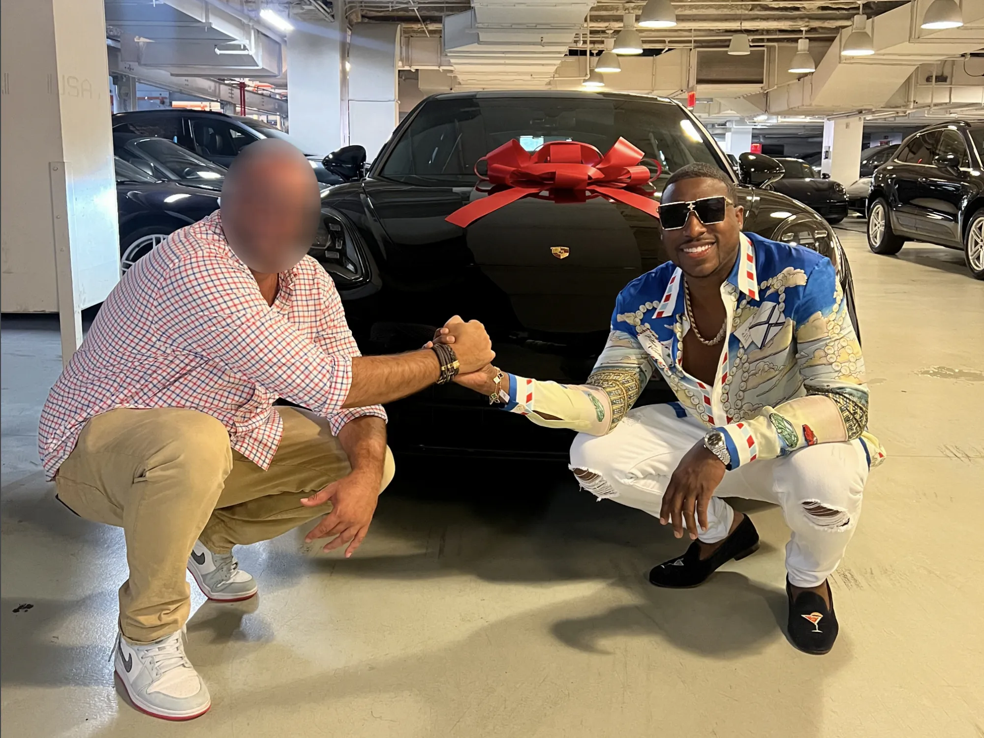 Ingrid Lewis-Martin的儿子Glenn Martin II与一名身份不明的男子和检察官称他用从两位寻求其母亲在市政厅帮助的纽约地产商那里获得的钱购买的保时捷合影。来源:曼哈顿地区检察官办公室作为交换,“Lewis-Martin充当了Vaid和Dwivedi的随叫随到的顾问,随时为他们服务,以解决他们在建筑项目中遇到的任何问题,”Bragg说。