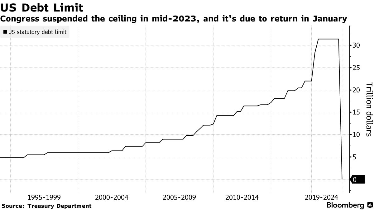 这是对美国政府借款的上限,最初由国会 在1917年建立。由于立法者不断通过法案支出超过政府收入的资金,财政部必须不断借款,导致债务上升。这需要解决债务上限问题,否则就面临违约风险。最后一次采取的行动是在2023年6月,当时立法者暂停了上限,直到2025年初。