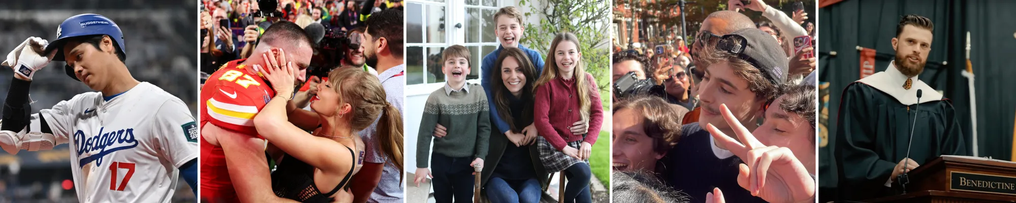 在左上角,我们有 Gearoid Reidy的 专栏,关于 大谷翔平丑闻。然后是 泰勒·斯威夫特和特拉维斯·凯尔斯引发的全球赌博热潮, 利昂内尔·劳伦特在这里进行了报道。之后, 贝丝·科维特写了关于或许是 年度最糟糕的公关危机,最终以每个人删除他们关于凯特·米德尔顿的糟糕推文而告终,因为她透露了 她与癌症的斗争。接下来是蒂莫西·柴勒梅德的 模仿比赛,我有幸参加了。最后一排的则是 哈里森·巴特克,他给新毕业生们进行了关于婚姻价值观和“恶魔般的谎言”的糟糕讲座。
