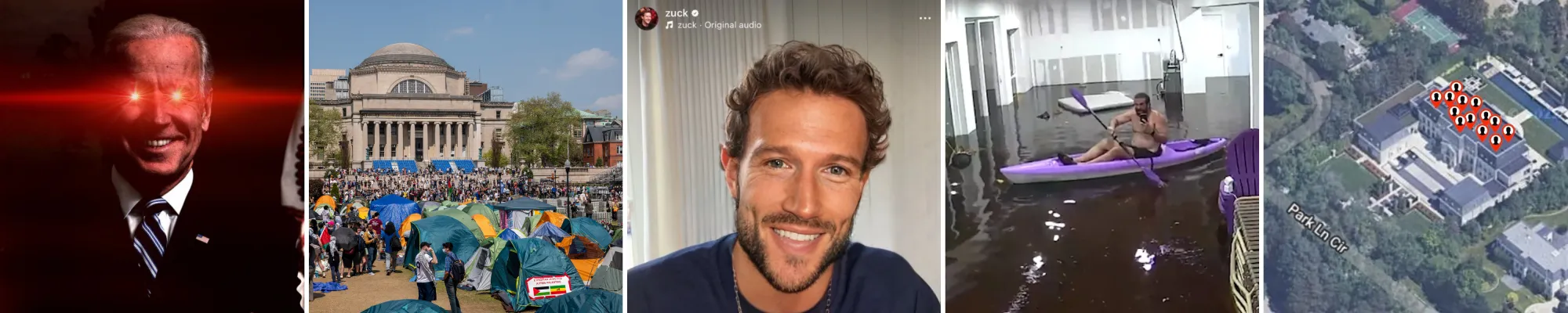 在即将成为总统的人物下方是肯德里克·拉马尔的“与我们不同”单曲的专辑封面,威廉·E·凯彻姆三世表示这在他们的说唱对决中给德雷克的伤口添加了很多盐。隔壁,你有一种非常不同的与大自然的斗争。 在自己客厅里划皮艇的男人在飓风海伦之后是一个可怕的画面,但马克·贡戈洛夫表示我们应该习惯于随着地球变得越来越热。年初,戴夫·李对马克·扎克伯格的20年成功公式过期发表了看法。我不认为解决方案是AI生成的潮流,但继续吧!然后是关于加沙的校园分歧,这从哥伦比亚大学蔓延到全国,引发了关于言论自由的激烈辩论,正如斯蒂芬·卡特和诺亚·费尔德曼所报道的。最后一位是黑暗布兰登,乔·拜登总统在他的竞选活动中首次亮相于超级碗。