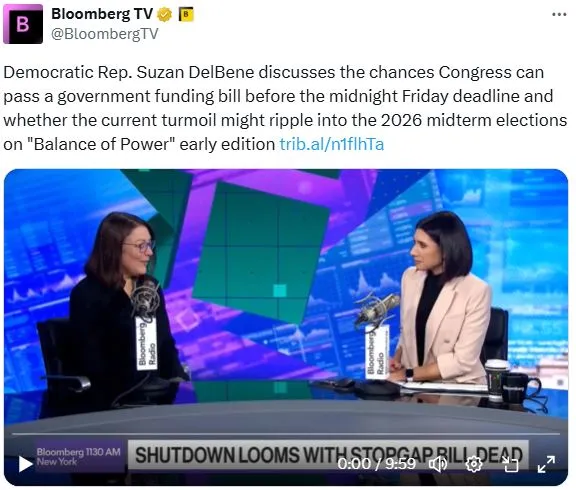 今天在彭博电视台的 权力平衡 早间版中,主持人凯莉·莱因兹采访了民主党代表苏赞·德尔贝内,讨论国会在周五午夜截止日期之前通过政府拨款法案的机会,以及动荡对中期国会选举的潜在影响。
