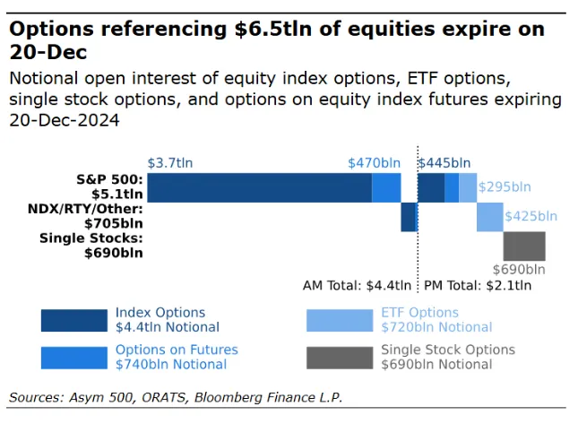周五的美国期权到期,历史上曾引发波动,为年末的平静提供了最后的障碍。根据衍生品分析公司Asym 500的估计,本季度的“三重女巫”现象使得价值约6.5万亿美元的与个股、指数和交易所交易基金相关的期权到期,这是今年最大的一次。