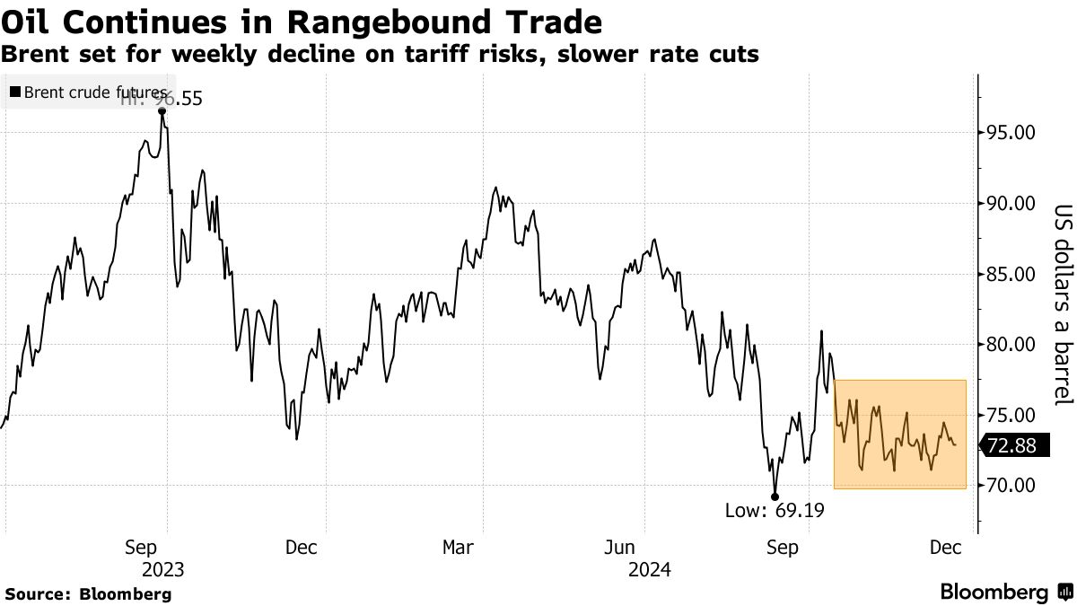 原油在投资者权衡美联储减息速度放缓和当选总统特朗普威胁对欧盟国家征收关税以迫使其购买更多美国石油和天然气的情况下,录得周度亏损。