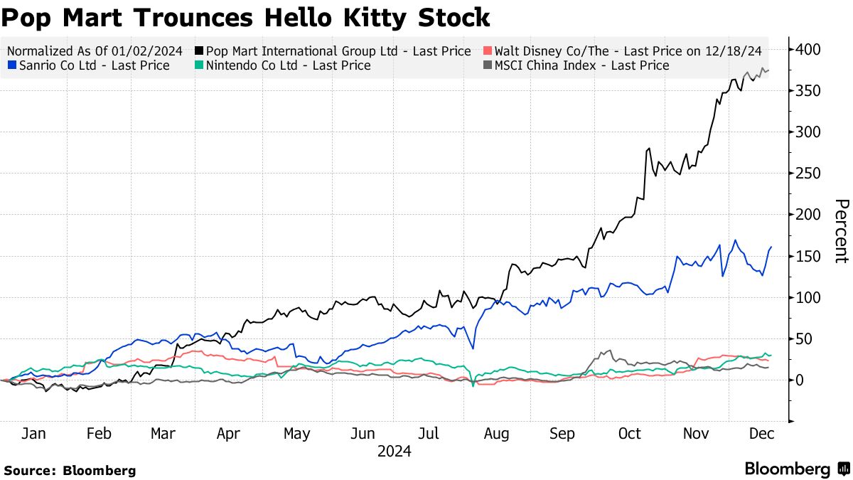 对其多样化玩具的热情使泡泡玛特成为最热门的中国成长公司,今年股价上涨了368%,远超大多数MSCI中国指数的成分股。它还超过了全球同行,如华特迪士尼公司和Hello Kitty的母公司三丽鸥有限公司。该公司报告称,国内销售在九月份季度同比增长至少55%,而海外销售激增超过400%。