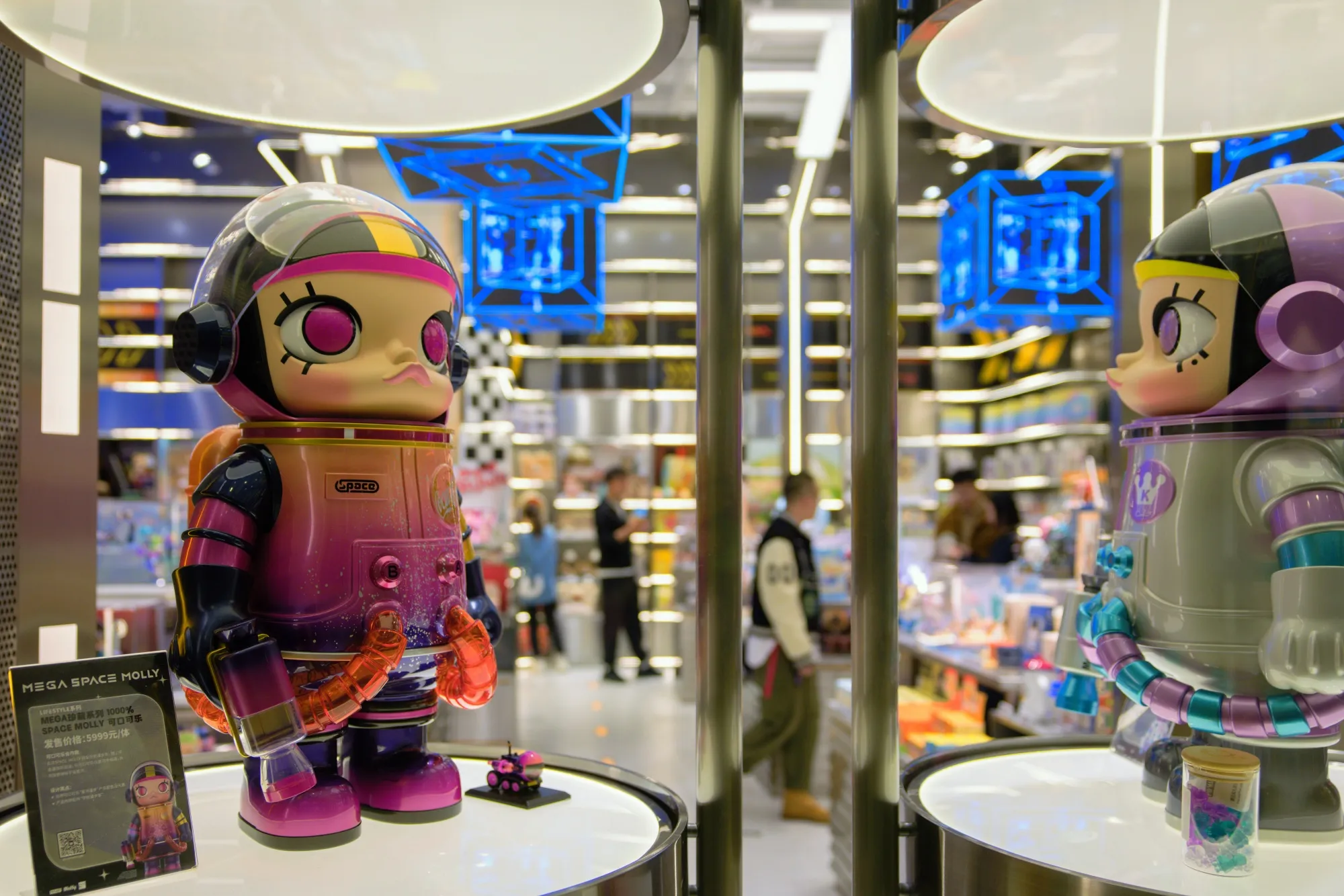 泡泡玛特通常将其玩偶放在盲盒中出售,这意味着消费者在打开之前不知道里面是什么具体角色。它们的新奇之处在于其情境化、角色驱动的设计,粉丝们因其情感吸引力而重视这些设计。以零售商的标志性角色莫莉为例,她是一个短发女孩,常常撅着嘴。她可以以太空莫莉的形象出现,作为穿越宇宙的宇航员,或者以婴儿莫莉的形象出现,描绘她作为一个三岁的小女孩。对于海外市场,该公司创造了量身定制的设计,例如在巴黎卢浮宫商店出售的蒙娜丽莎般的怪物。