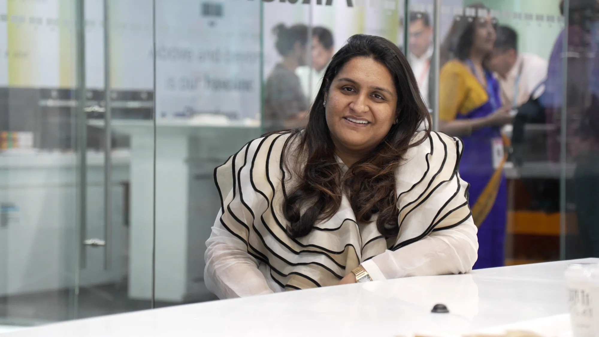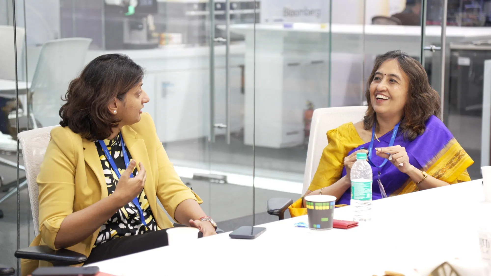 达斯古普塔在孟买与其他女性领导者进行圆桌讨论时发言,谈论印度的交易和她们在推动繁荣中的角色。