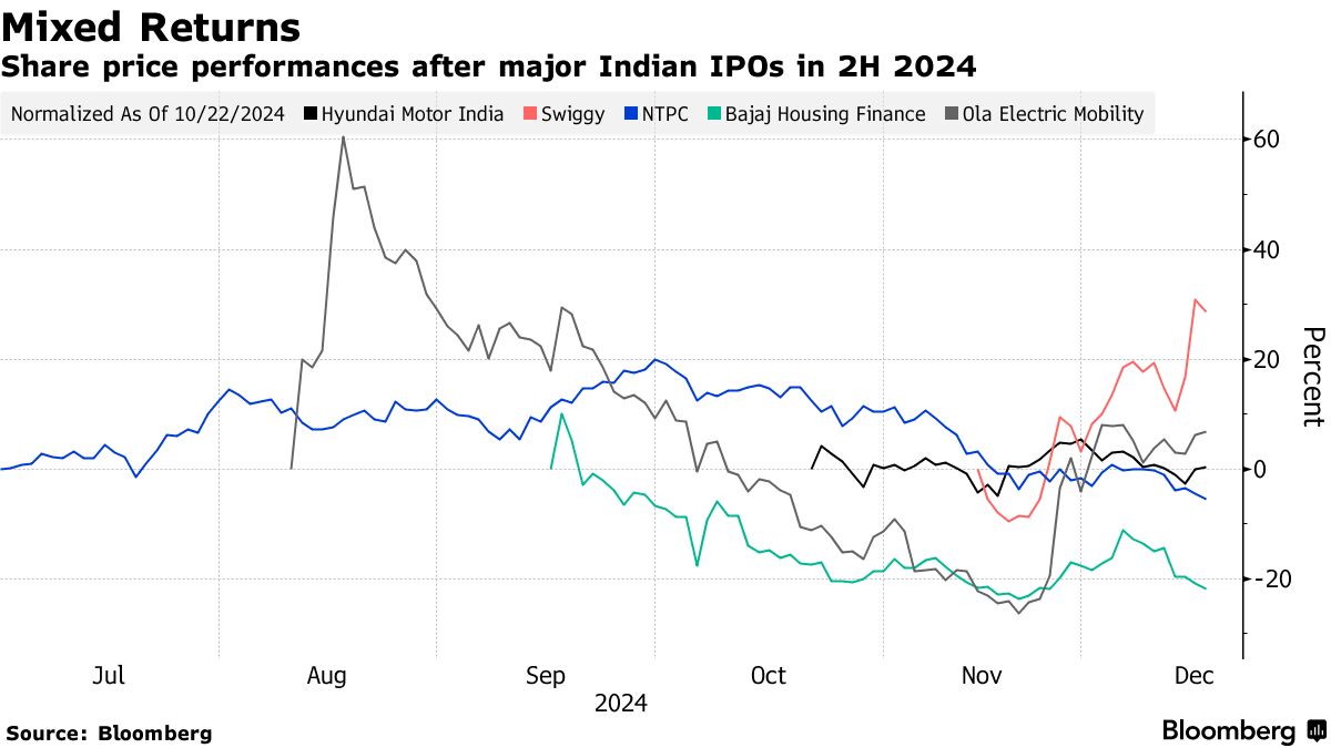 并非所有的首次公开募股都带来了显著的收益。在创纪录的努力之后,现代印度的交易价格低于每股1,960卢比的发行价。但在更大的首次公开募股中,赢家远远超过输家。Bajaj Housing Finance Ltd.在9月上市后,价格比发行价高出80%以上,Bharti Hexacom Ltd.和Swiggy也获得了可观的收益。
