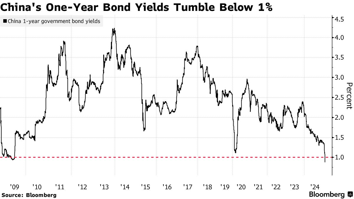 中国的一年期债券收益率跌破了全球金融危机期间的水平,降至二十多年来的最低点,这主要是由于对激进政策宽松的押注和对避险资产的需求。