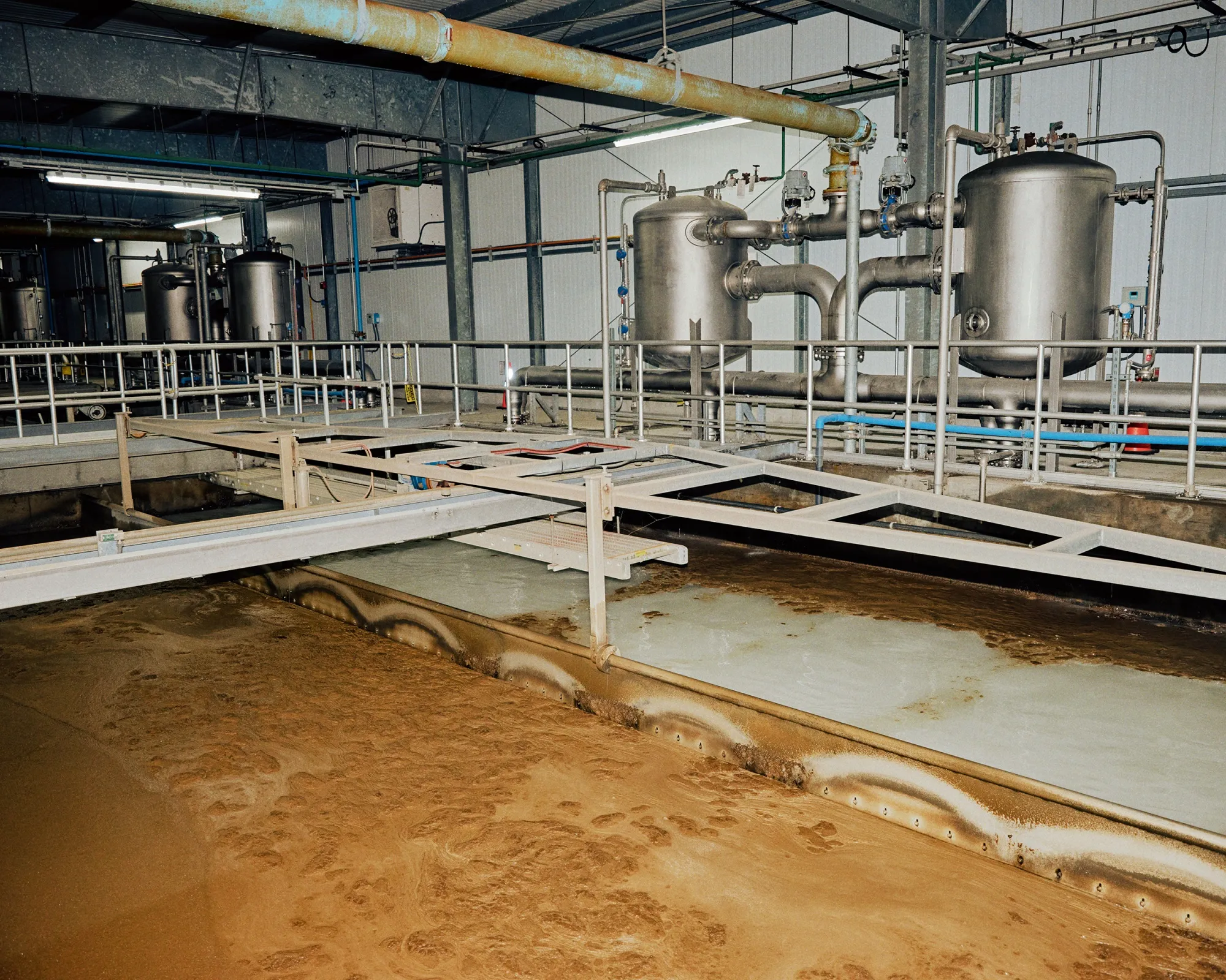詹姆斯·法希,运营总监,和泰勒·卡登,生产总监,右侧,在新泽西州维奥利亚北美的霍沃斯工厂。摄影师:大卫·卡布雷拉/彭博社在新泽西州维奥利亚北美的霍沃斯工厂,运营总监詹姆斯·法希走过将外面覆盖藻类的水库转变为安全、晶莹的饮用水的复杂流程。在水被输送到超过100万居民之前,它会经过臭氧处理以去除铁和锰等重金属,添加氯以杀死病原体,并通过由越来越细的沉积物和沙子层组成的过滤器。