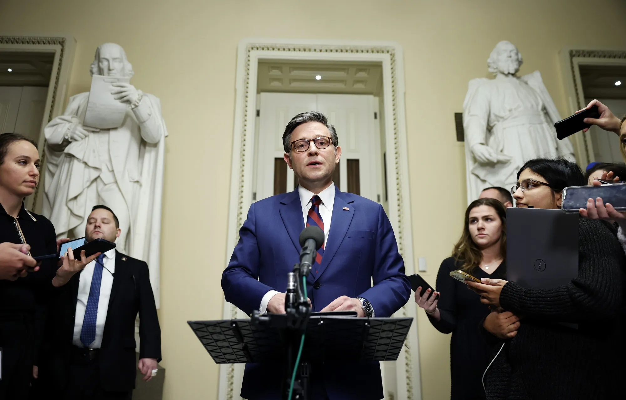 众议院议长迈克·约翰逊。摄影师:凯文·迪特施/Getty Images**现在是计划C。**由共和党主导的众议院拒绝了一项临时资金计划,该计划得到了唐纳德·特朗普的支持,留给立法者几个小时的时间,以防止午夜时分政府停摆。该法案以235票对174票失败,其中包括38名反叛的共和党人。