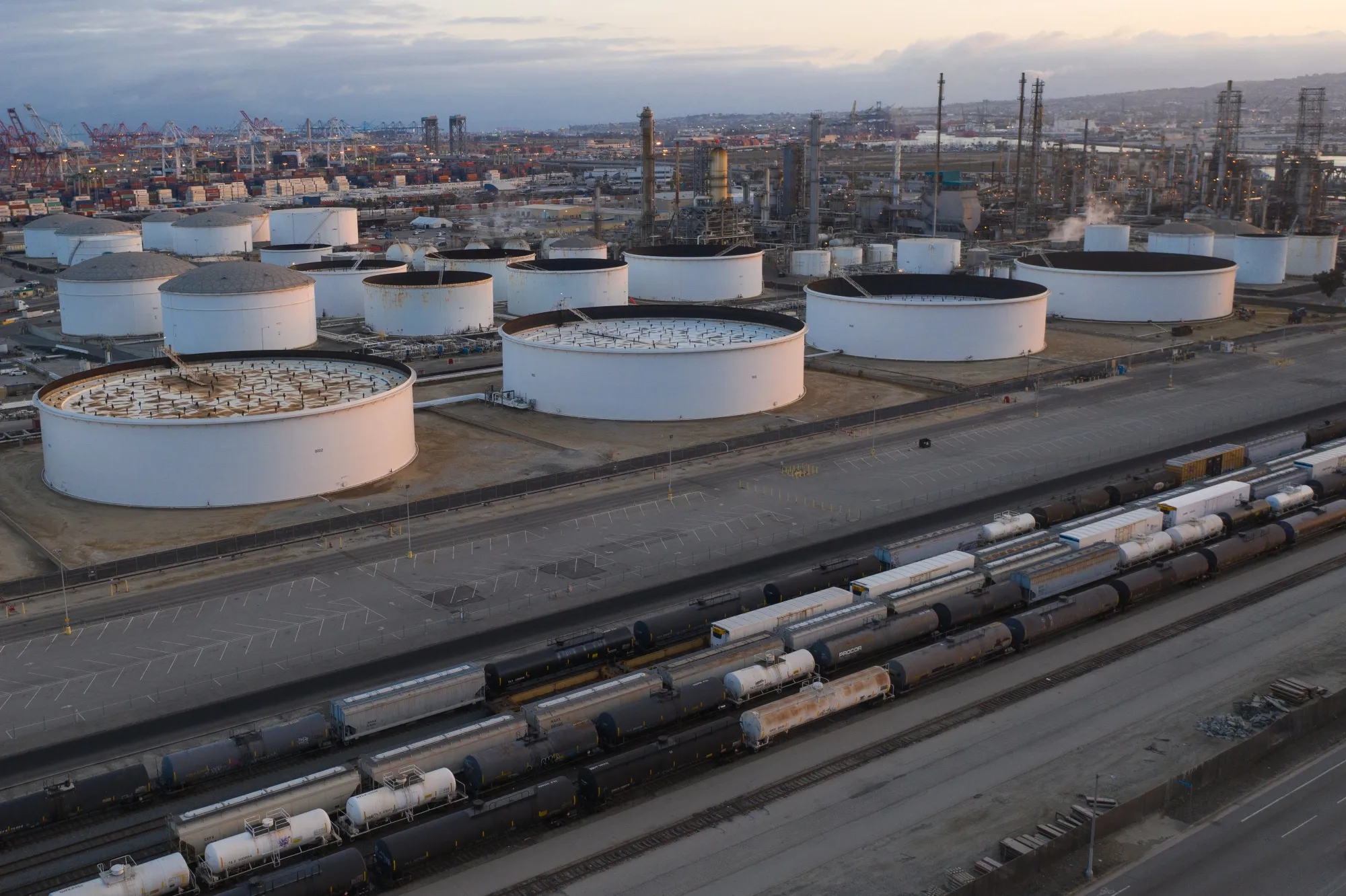 美国加利福尼亚州威尔明顿的一座炼油厂和一个铁路货场。