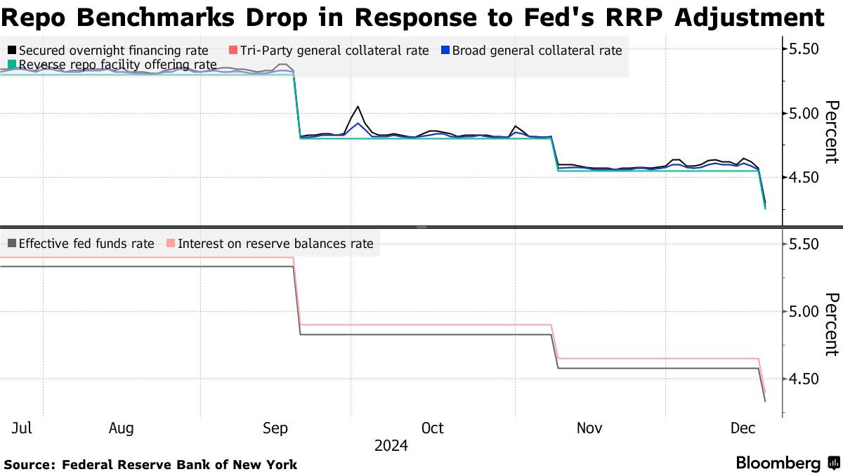 根据纽约联邦储备银行周五发布的数据,担保隔夜融资利率截至12月19日降至4.30%,低于4.57%。这使其仅高于中央银行隔夜逆回购协议设施的新报价利率4.25%。