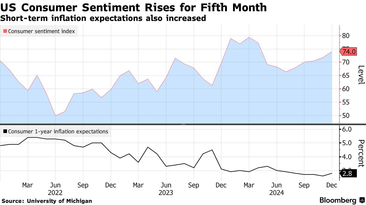 根据密歇根大学的数据,12月份的最终信心指数从上个月的71.8上升至74。彭博社对经济学家的调查中,中位数预期为74.2。
