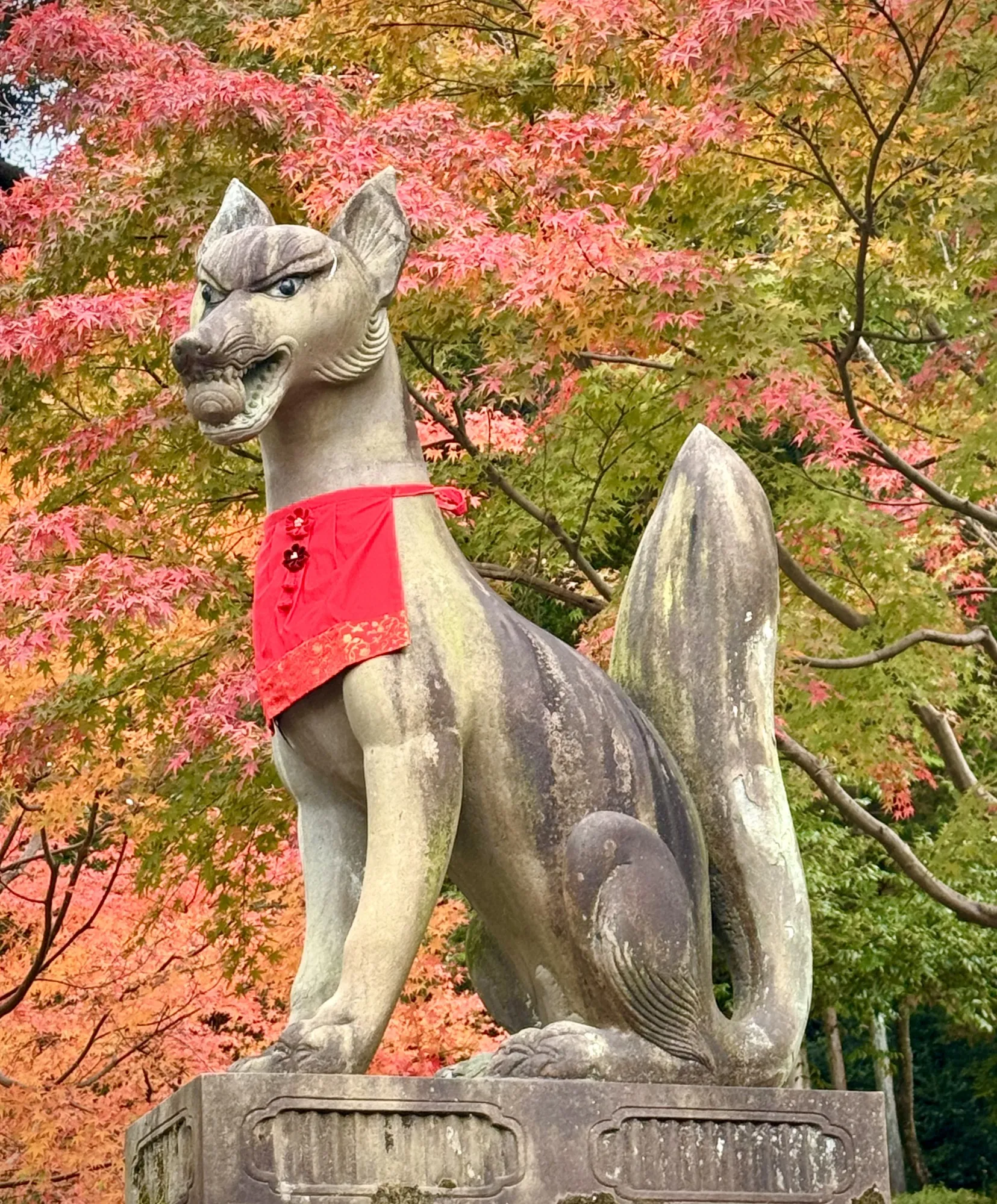 在京都伏见区著名的红色鸟居前的游客。摄影:Howard Chua-Eoan/Bloomberg但我来是为了狐狸。稻荷是稻米的神道神灵——也是商业的神灵(因此有红色的门,这些是商人为了商业成功而捐赠的)。稻荷最初是女性,然后是男性,再然后是两者兼而有之,白狐狸作为信使和预兆的承载者,陪伴在稻荷身边。你会在伏见地区的主要交叉口或神社入口看到它们成对出现。