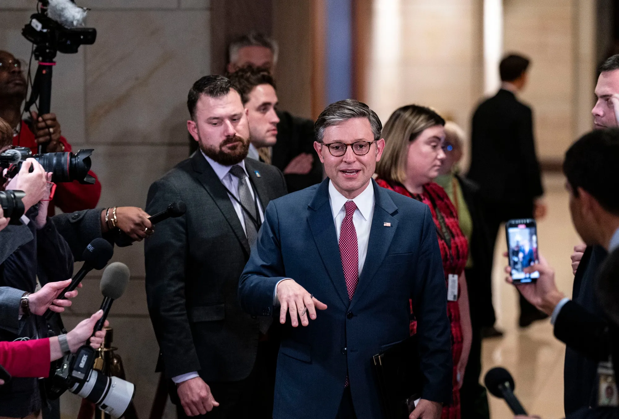 美国众议院议长迈克·约翰逊,来自路易斯安那州的共和党人,在与埃隆·马斯克会晤后向媒体成员发表讲话。
