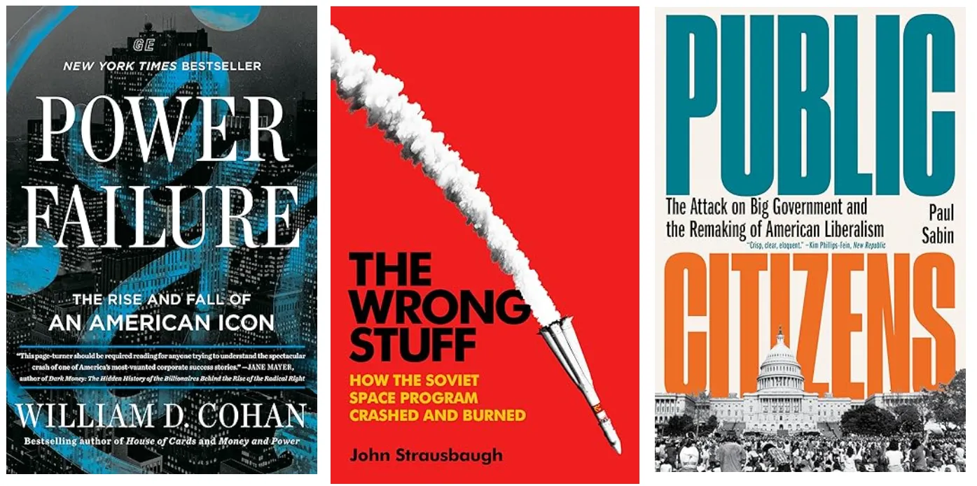 我们询问了 我们的嘉宾 Sam D’Amico,周一的节目 **和 Impulse Labs 的创始人,**他推荐了 Bill Cohan 的 电力故障:一个美国偶像的兴衰、 错误的东西:苏联航天计划如何崩溃和燃烧 和 公共公民:对大政府的攻击与美国自由主义的重塑。
