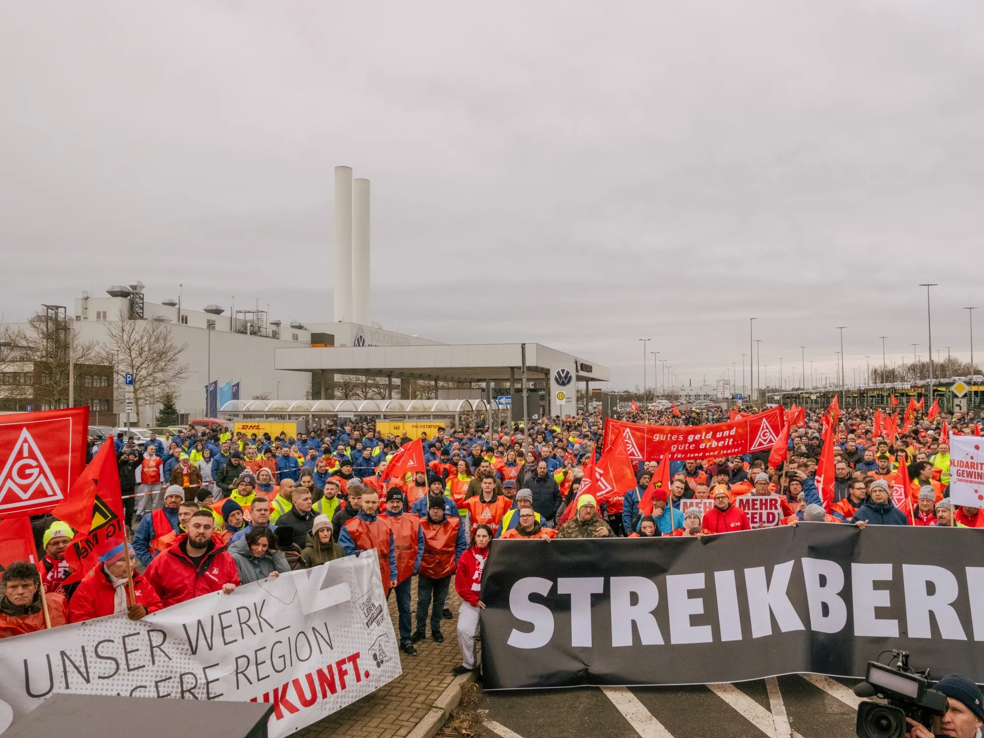 工人在12月2日于兹维考的大众汽车工厂进行临时罢工。摄影师:艾欧娜·杜茨/彭博社大众汽车公司与工会领导达成协议,削减其自有品牌的产能,同时避免工厂关闭,结束了三个月的紧张谈判,并防止了进一步的工会罢工。