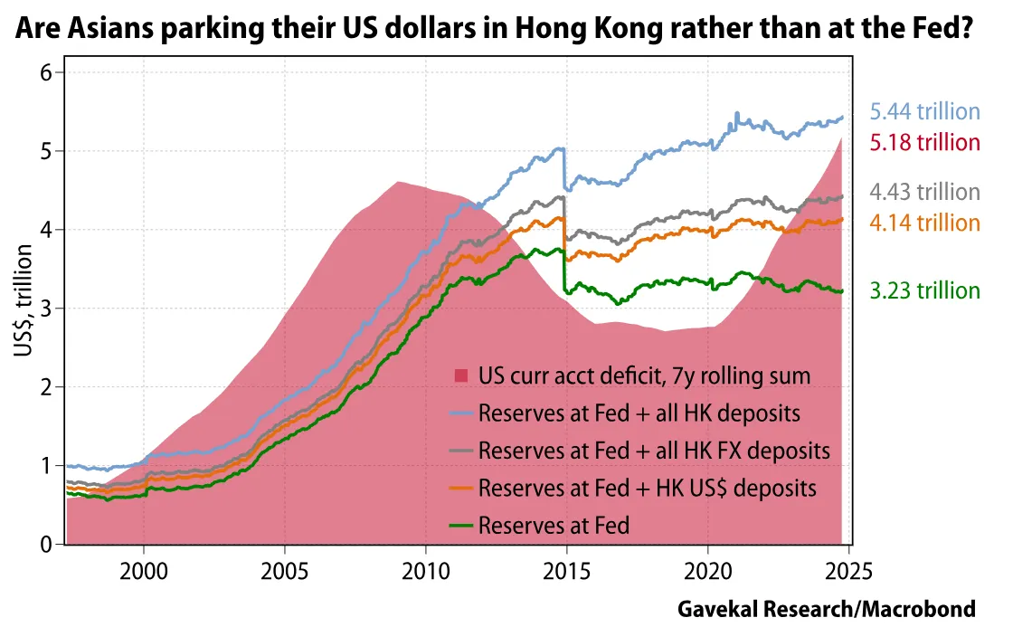 确实,Gavekal研究集团创始人查尔斯·盖夫本周推测,香港可能成为新国际金融体系的潜在核心。盖夫强调,近年来香港美元储备的增加,可能是亚洲出口商选择将其收益留在美国以外的一个潜在迹象。