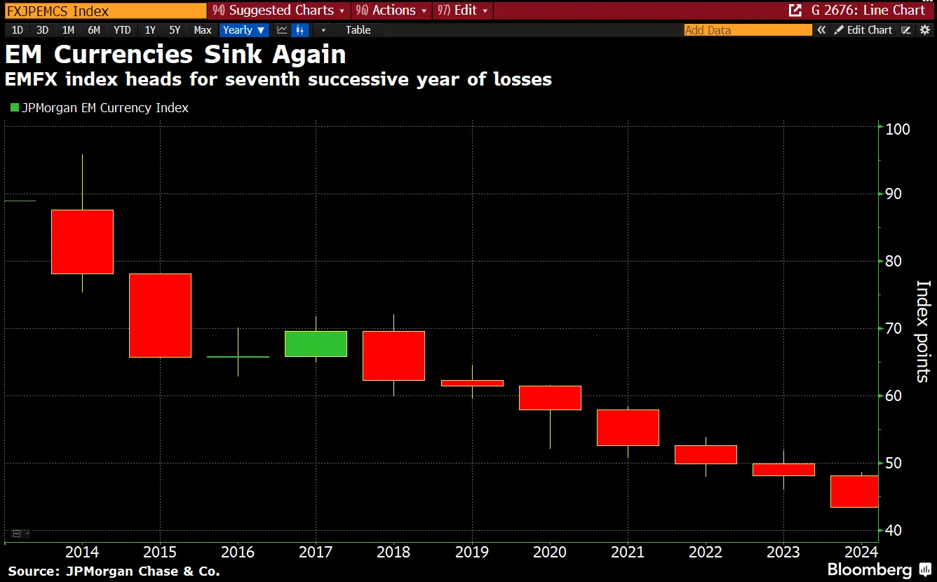 新兴市场挣扎的核心在于大多数国家无法赶上美元。摩根大通的EM货币指数正面临连续第七年的亏损。在2024年,除马来西亚林吉特和港元外,所有主要新兴市场货币对美元均贬值。至少有九种货币的贬值幅度超过10%。