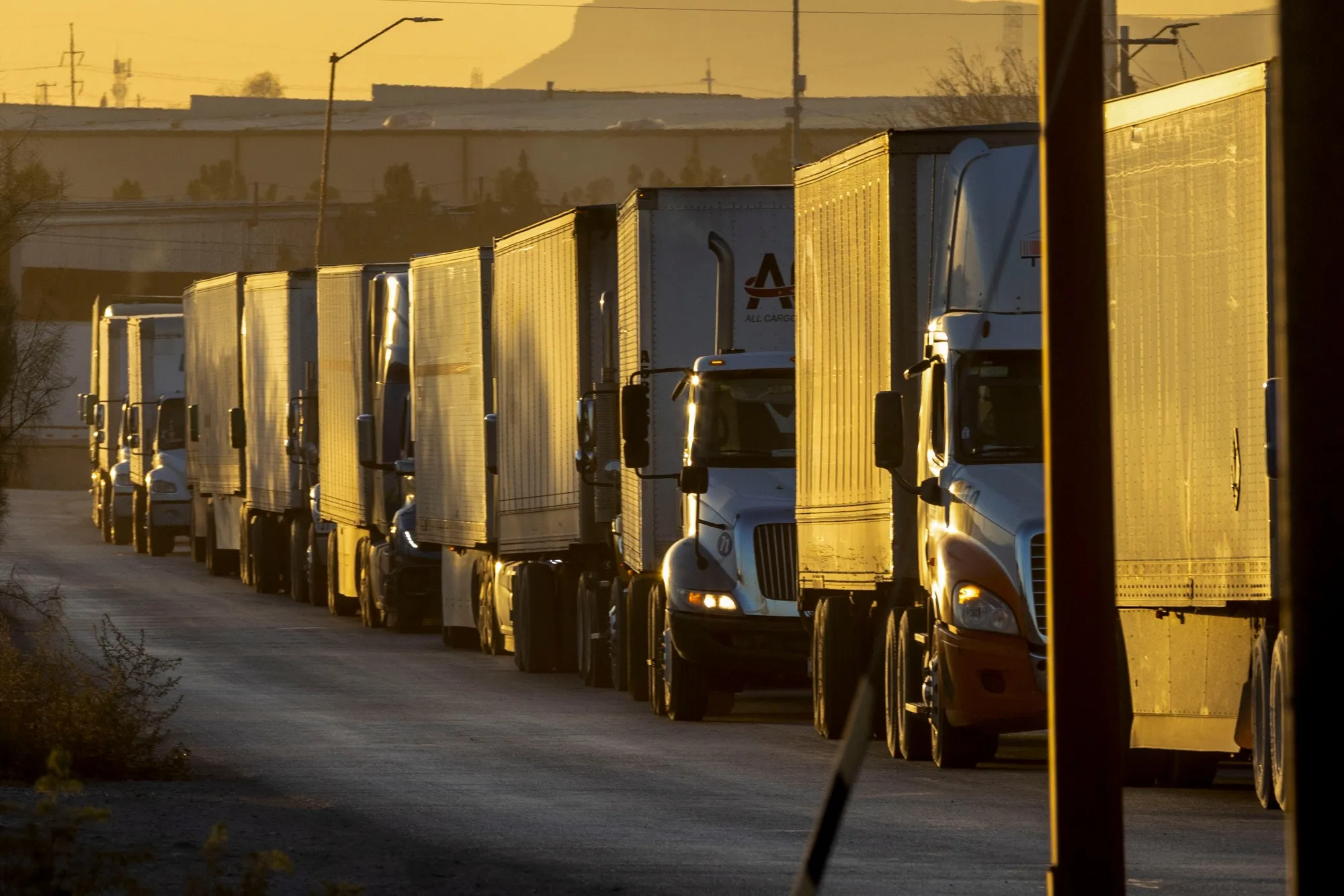 拖车在美国-墨西哥边境的华雷斯,奇瓦瓦州,墨西哥排队等候。
