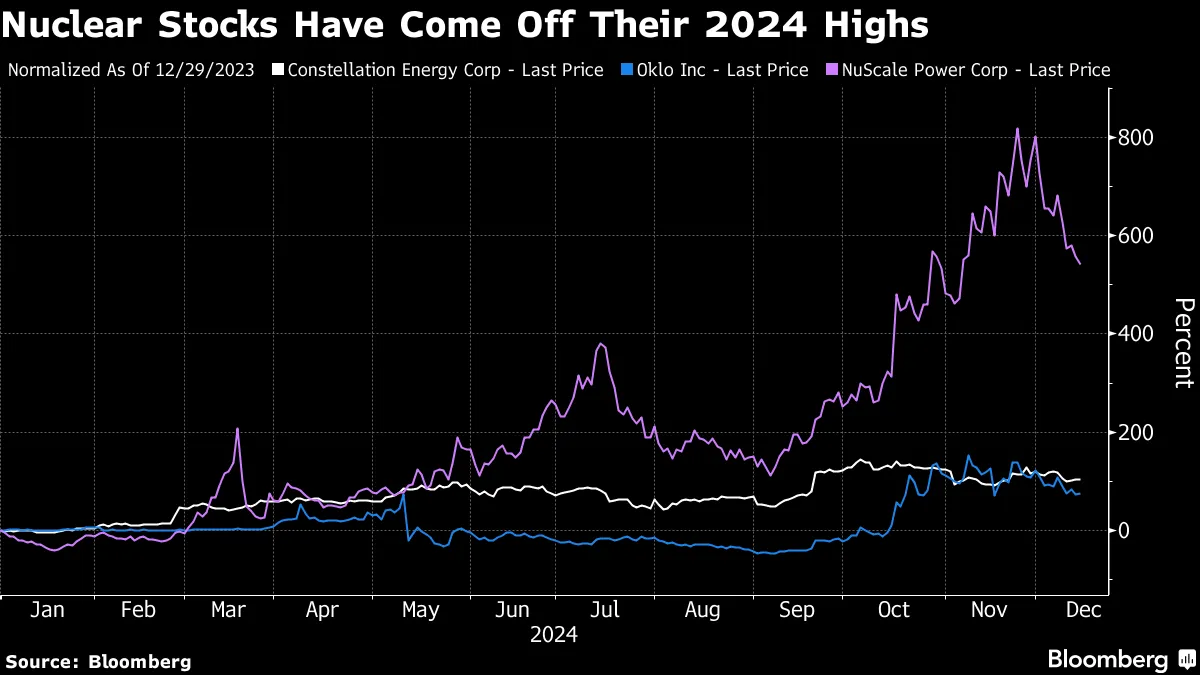 被热情浪潮卷起的股票包括康斯特ellation能源公司,该公司在其关闭的三里岛核电厂复兴的背景下,今年几乎翻了一番,复兴,以及NuScale Power Corp.,其股价在11月底之前飙升超过800%。
