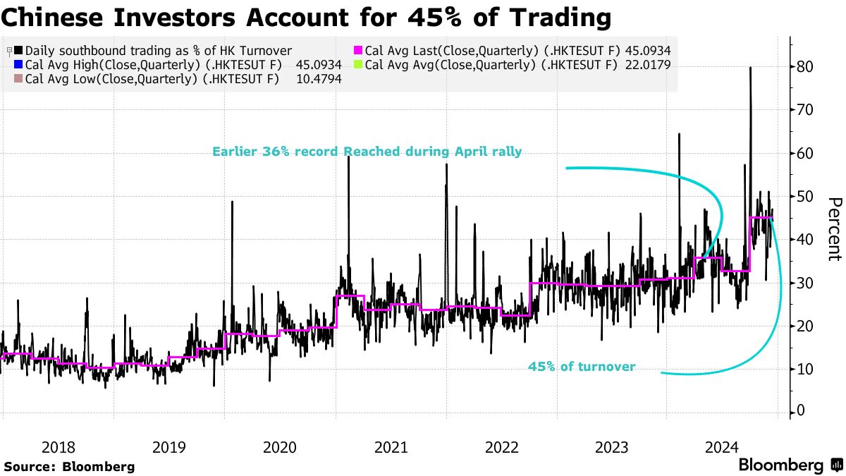 大陆中国投资者在动物精神复苏和人民币贬值的背景下,创纪录地购买了香港股票,增加了对该市风险资产的敞口。