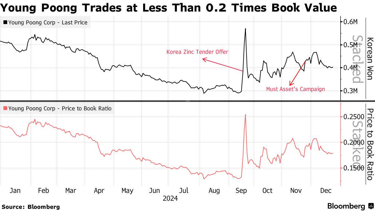 该公司拥有韩国锌业25%的股份,并与私募股权公司MBK Partners联合发起了对控股权的敌意收购要约。由于韩国锌业的股票大幅上涨,截至周五,这25%的持股价值达到了5.2万亿韩元(36亿美元),是永丰市值的七倍多。激增。